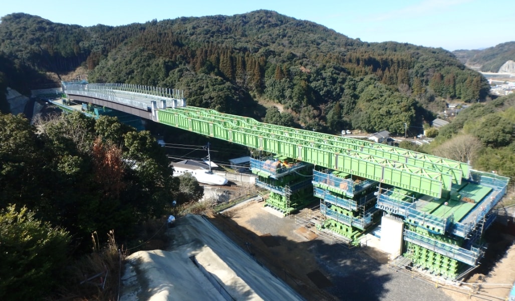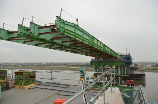 架橋する径間の橋軸方向隣接ヤードで地組した橋桁の先端に軽量な手延べ機(必要に応じて後方に後方桁)を取り付け、スライドジャッキやエンドレスローラー等の油圧機器を使って正規の位置まで送り出す工法です。隣接する桁の上から送り出すことも多く、その場合は正規の高さにジャッキダウンする必要があります。
