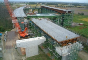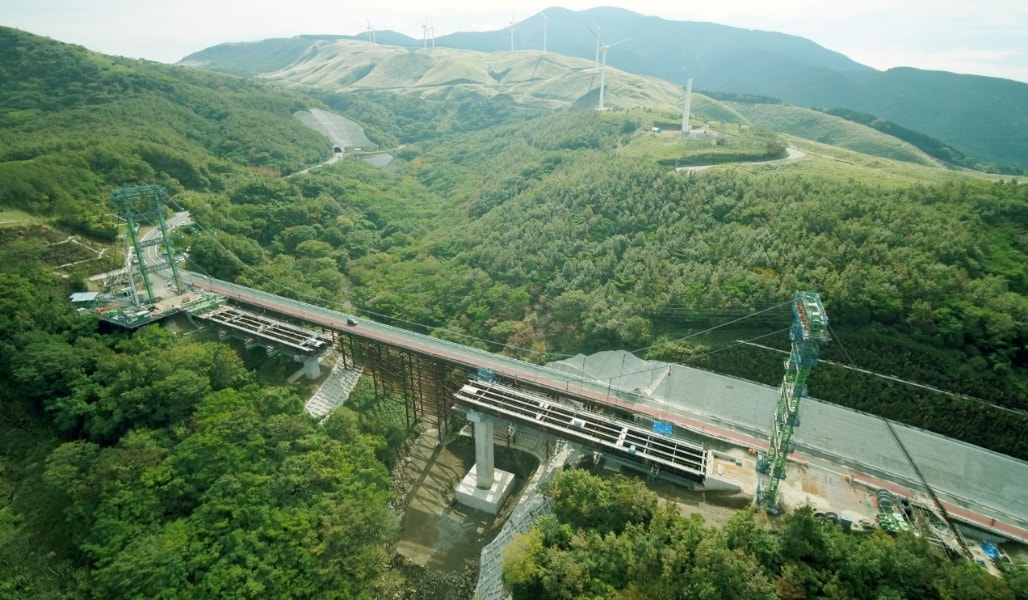 一般的なクレーンベント架設工法では、汎用的なクレーン車とベントと呼ばれる仮支柱を準備すれば架設作業を行うことも可能ですが、現場条件によっては、クレーンベント架設工法が採用できない現場も多々あります。鉄道上や大きな交差点上、山あいの渓谷や海上に位置する橋梁などがこれに該当します。
