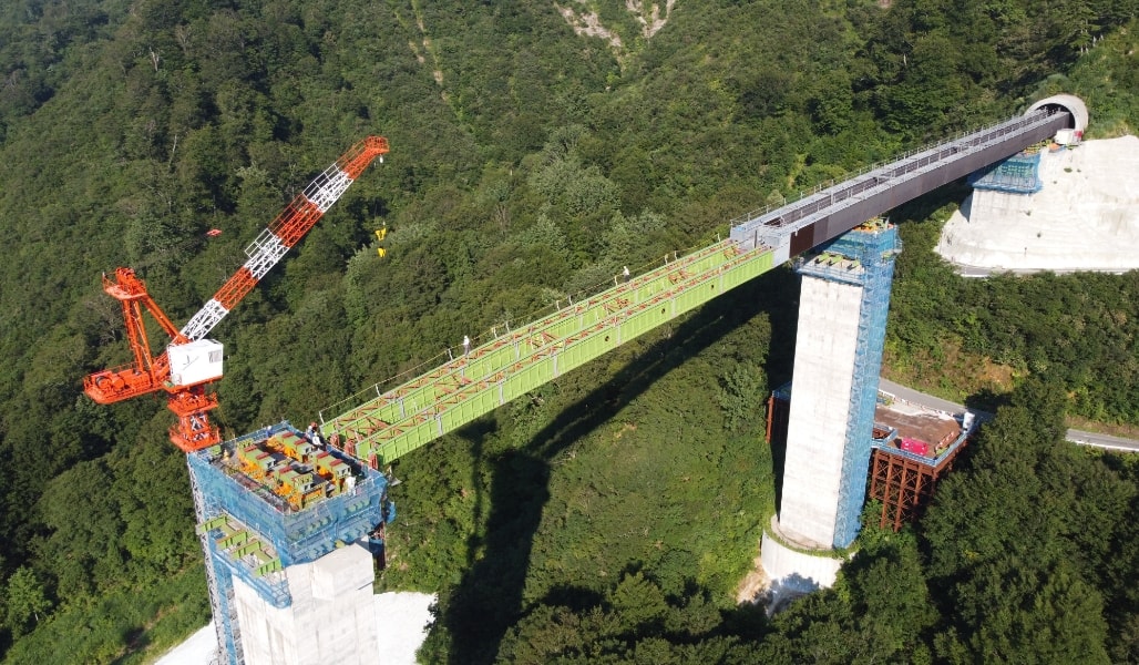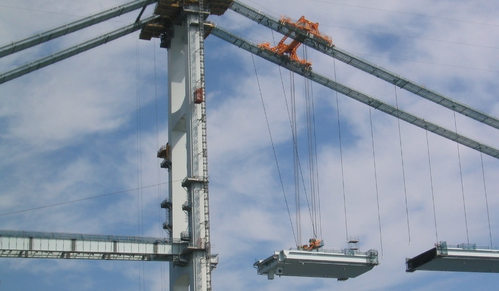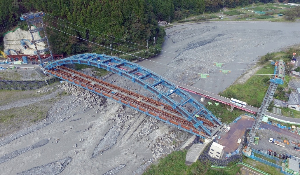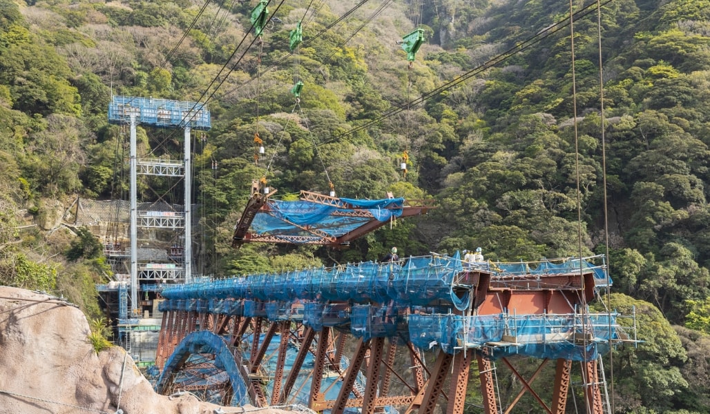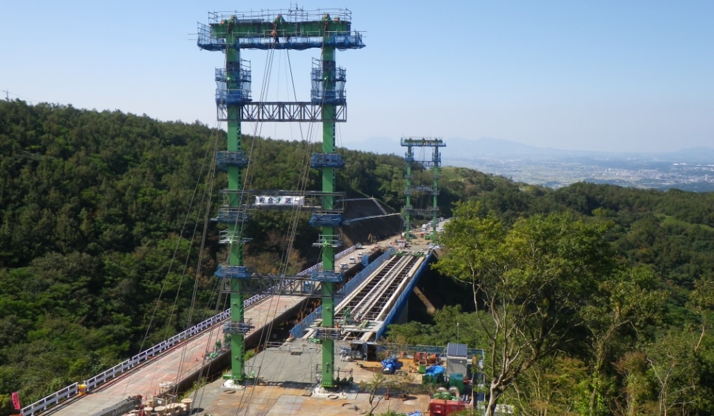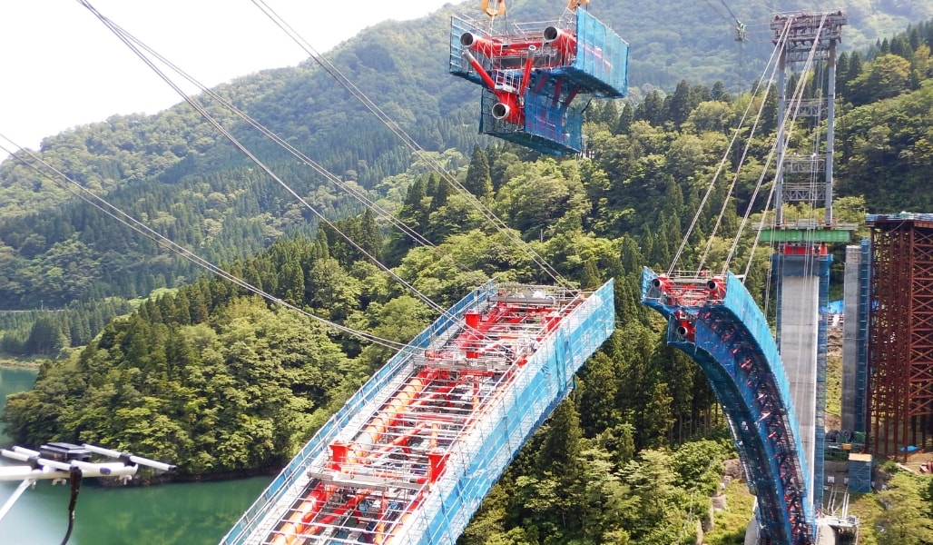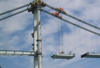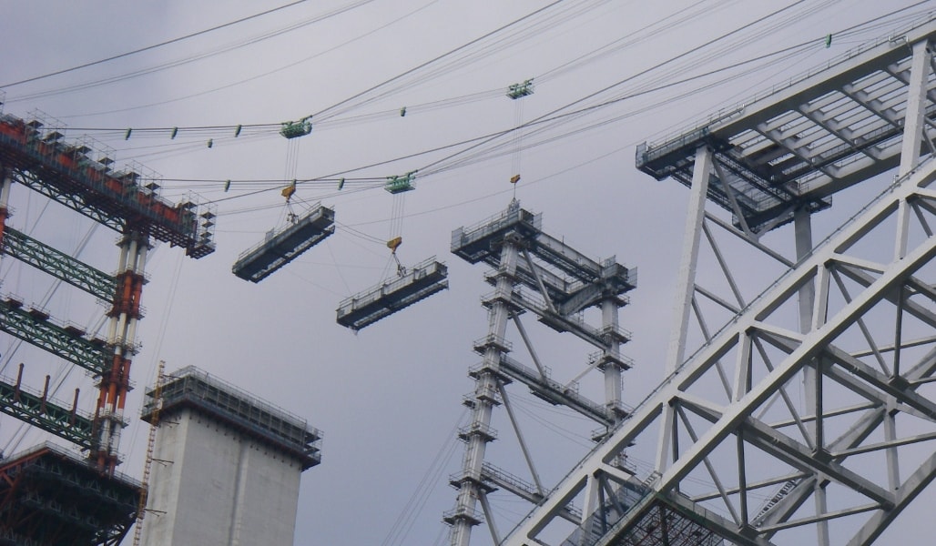 山間部や河川部等でクレーンの進入が難しい橋梁の架設を行う際に、2本の仮設鉄塔の間に展張したケーブルの上を移動するクレーン設備により橋桁の組み立てを行う工法です。組み立て途中の桁をベントで支持することが出来ない場合には、ケーブルクレーン設備とは別のケーブルから鉛直に吊り下げたワイヤーロープにより橋桁を支持するケーブルクレーン直吊工法と、仮設鉄塔の上から斜めに引っ張ったケーブルで支持するケーブルクレーン斜吊工法に分かれます。