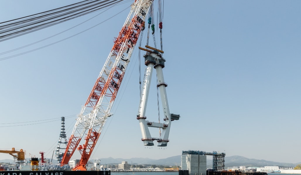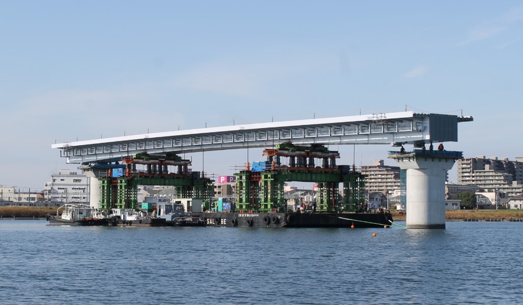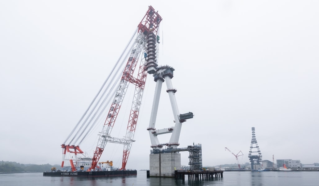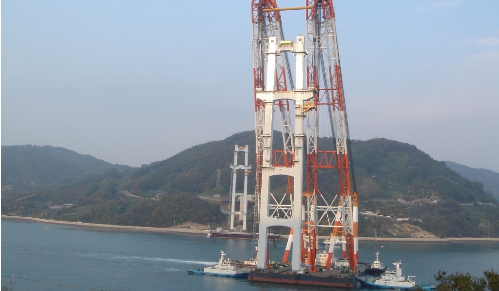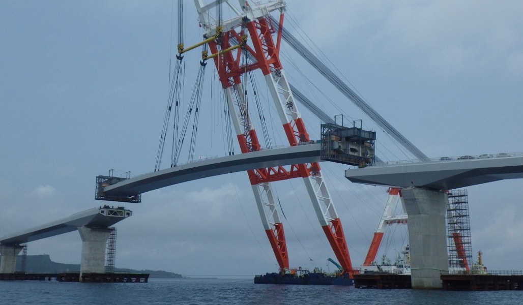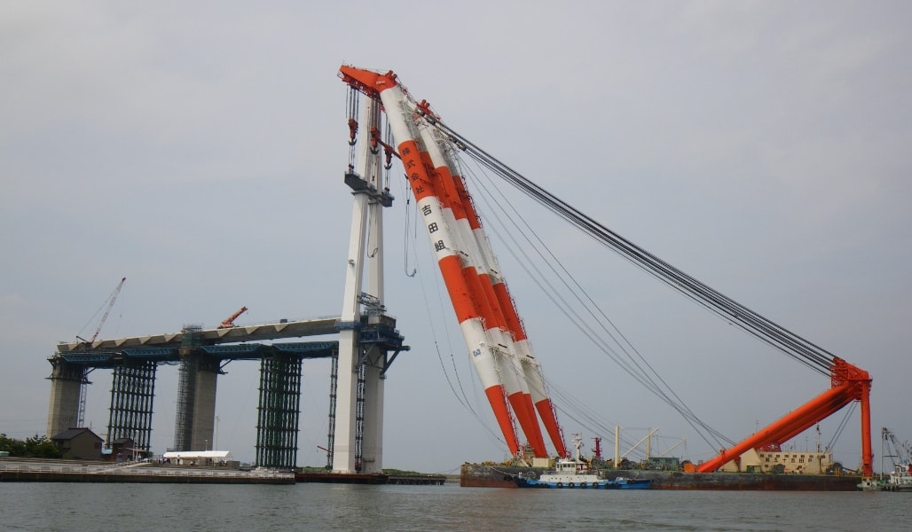 架設地点が海上であり、大型のフローティングクレーン(FC)が接近可能な場合は、岸壁ヤードにおいて地組した橋桁や主塔等の大きなブロックを、大型FCにより一気に架設する一括架設工法が用いられます。この工法では、架設に伴う海上封鎖等に伴う航行する船舶への影響を最小限に出来ると共に、安定した地上で地組を行うことにより、品質の向上も図ることも出来ます。