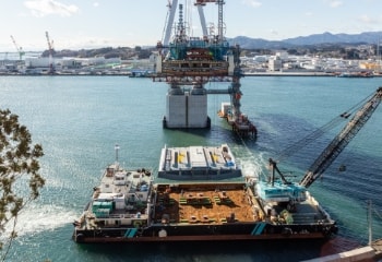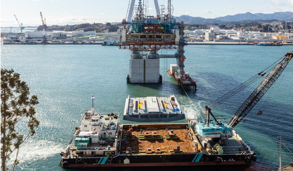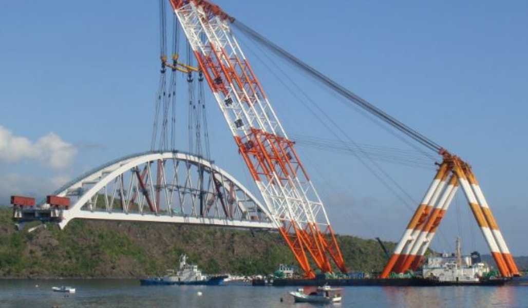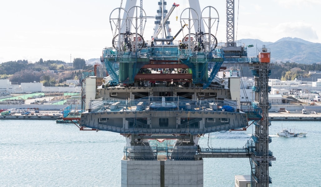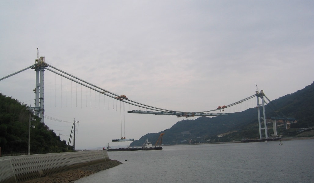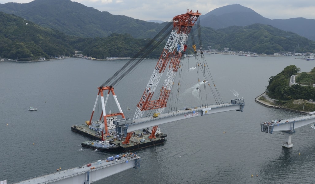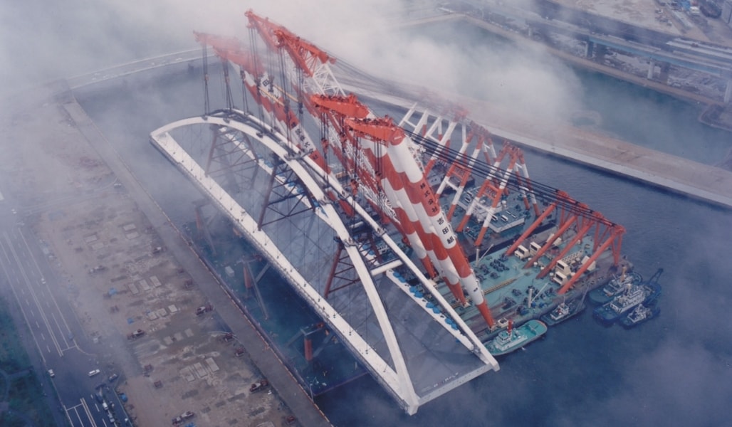 架設地点が海上であり、大型のフローティングクレーン(FC)が接近可能な場合は、岸壁ヤードにおいて地組した橋桁や主塔等の大きなブロックを、大型FCにより一気に架設する一括架設工法が用いられます。この工法では、架設に伴う海上封鎖等に伴う航行する船舶への影響を最小限に出来ると共に、安定した地上で地組を行うことにより、品質の向上も図ることも出来ます。