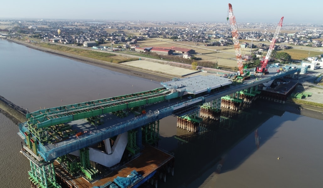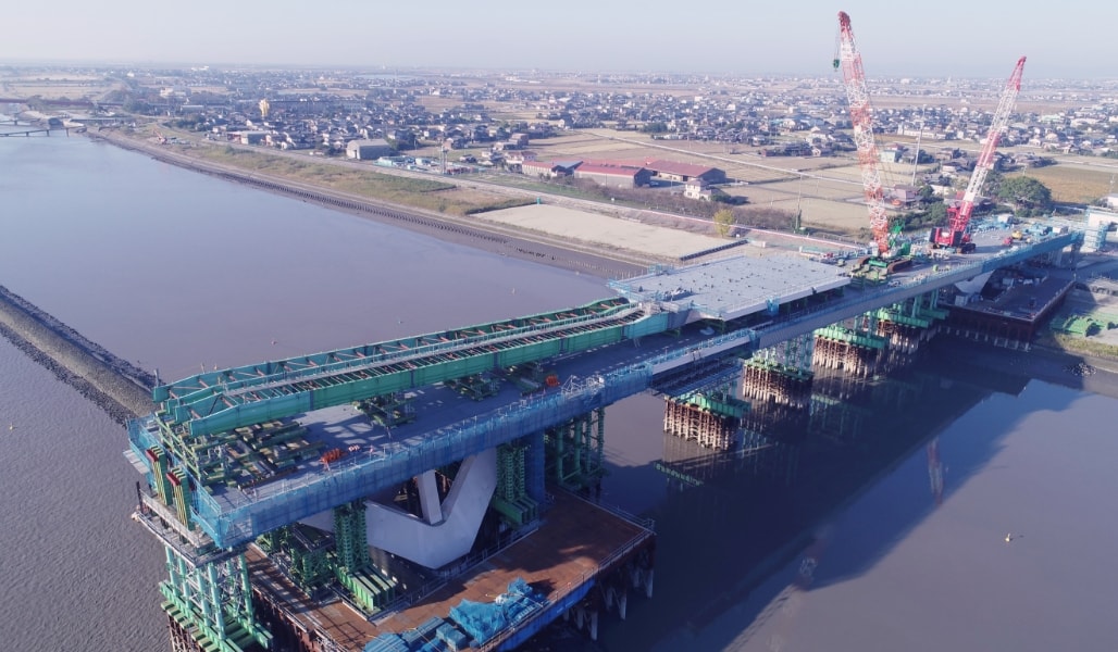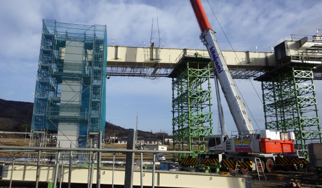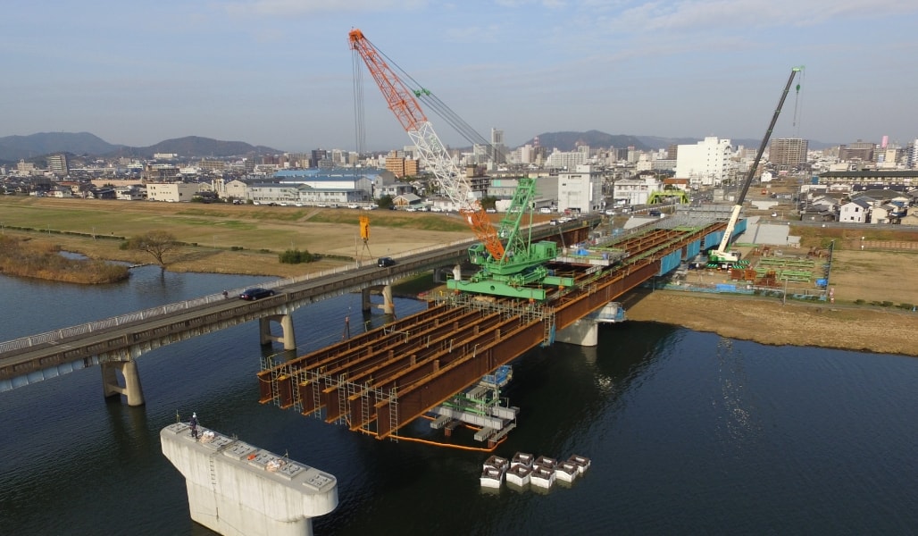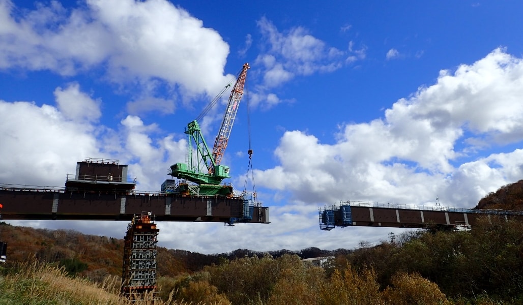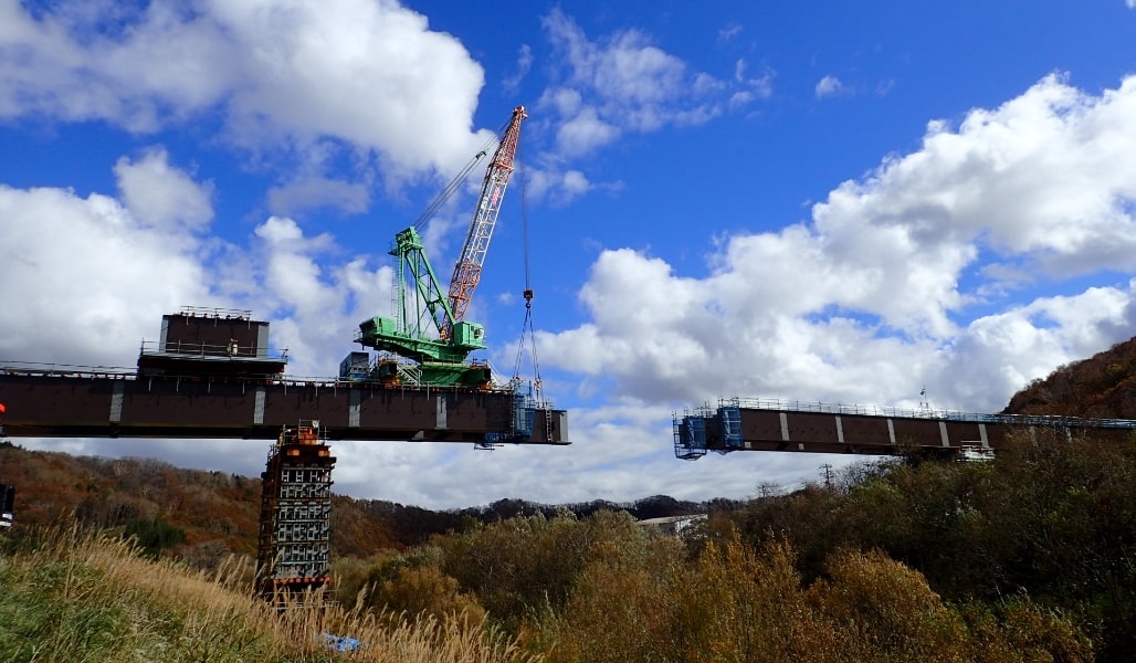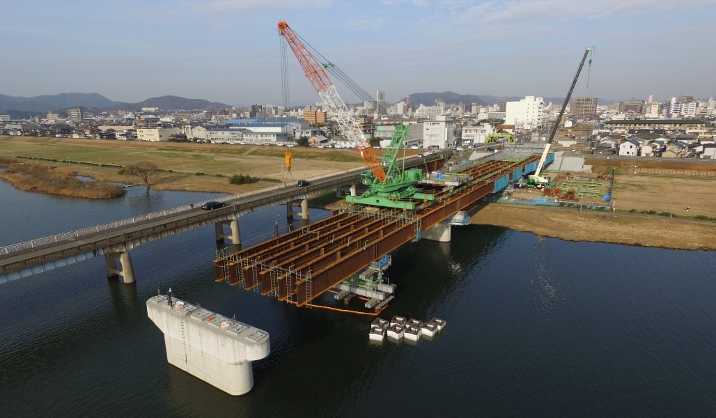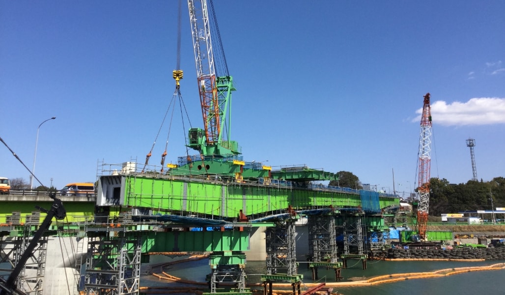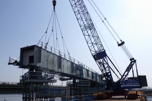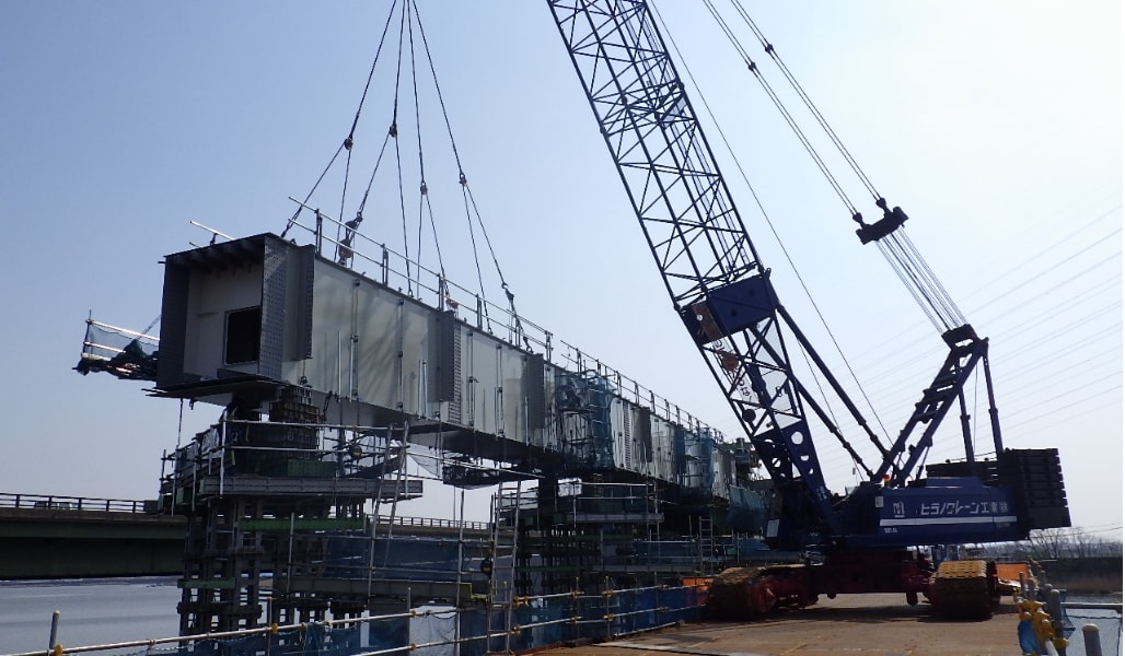 鋼製橋梁の架設工事においては、工場で製作された橋桁ブロック(10数ton)を架設現場にて組み立て、数百ton~数千tonにもおよぶ橋梁を完成させるものです。工事中には、そのブロックを架設位置まで運搬して組み立て、必要に応じて仮支持・移動させ、橋梁を完成させていきます。一般的な土木工事と比較して、現場でハンドリングする部材の重量が圧倒的に大きいのが工事の特徴のひとつと言えます。