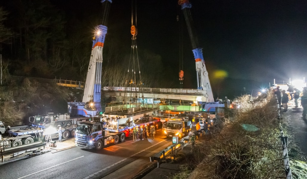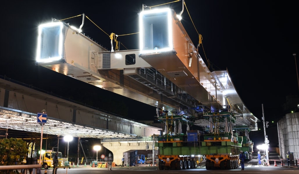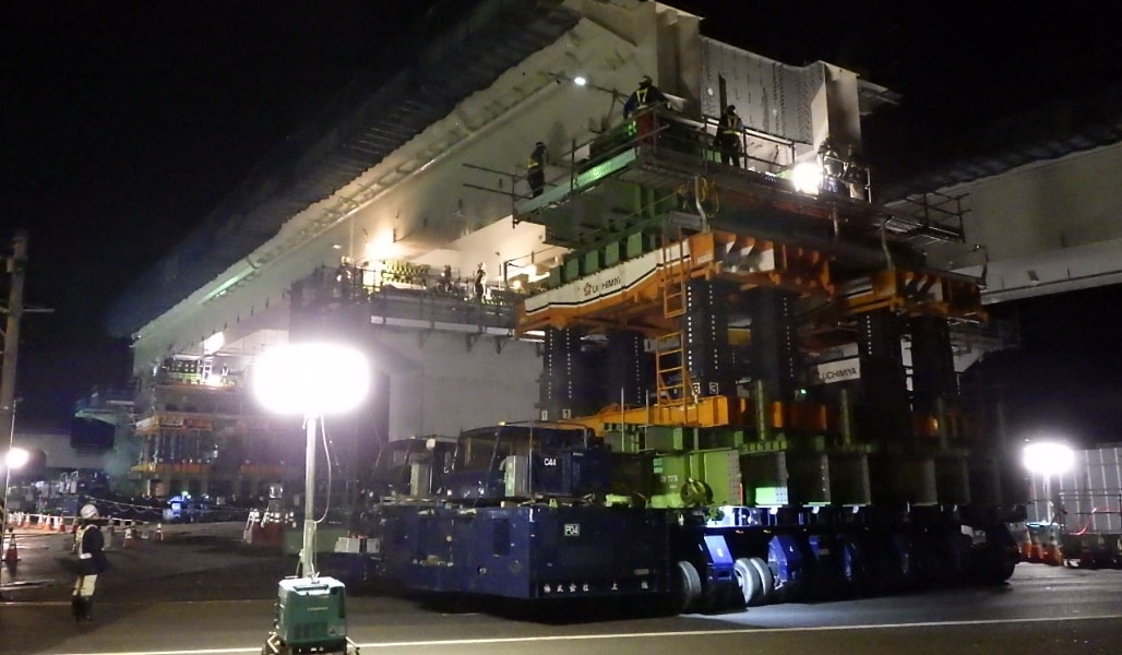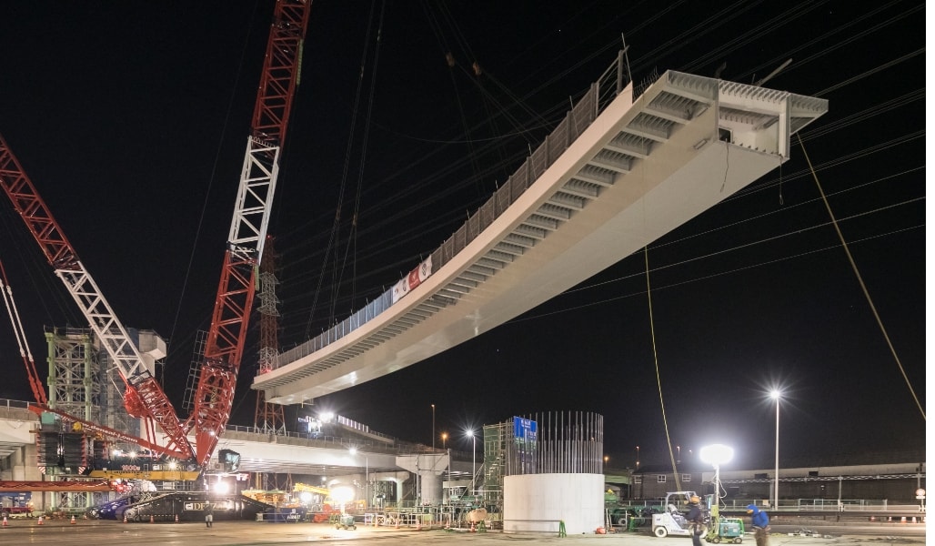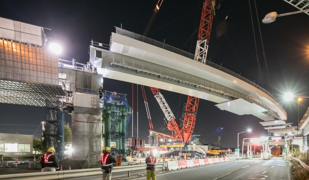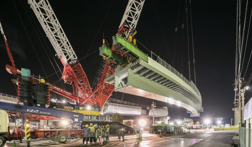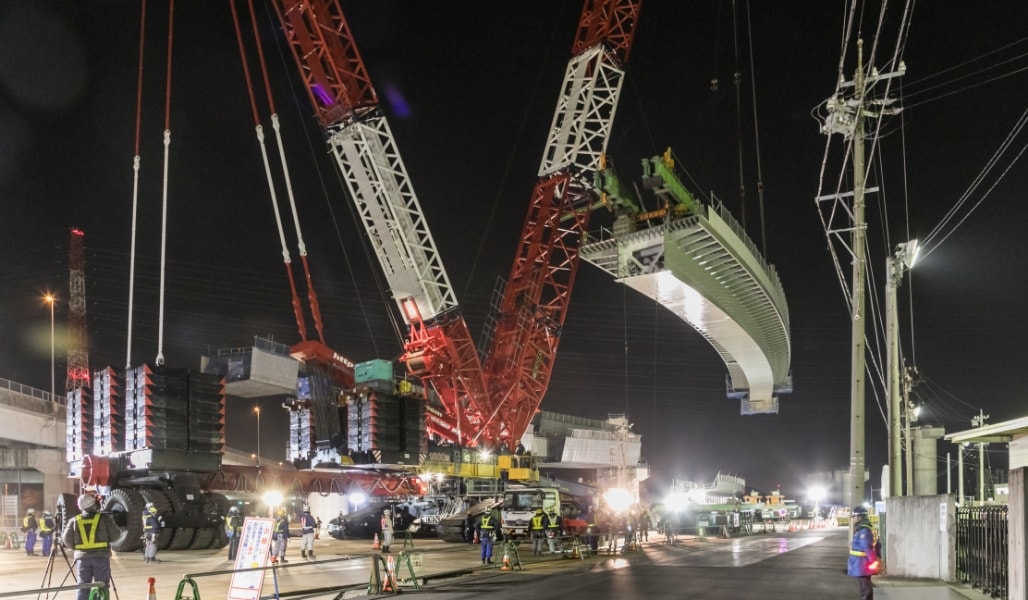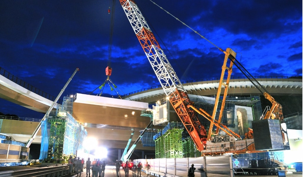 架設地点の近くに大型クレーンを組み立てるヤードが確保出来る時には、地組した大きな橋桁を大型クレーンにより一夜間で一気に架設する一括架設工法が用いられます。この工法では、架設作業に伴う通行止め等の交通影響を最小にすることが出来ます。