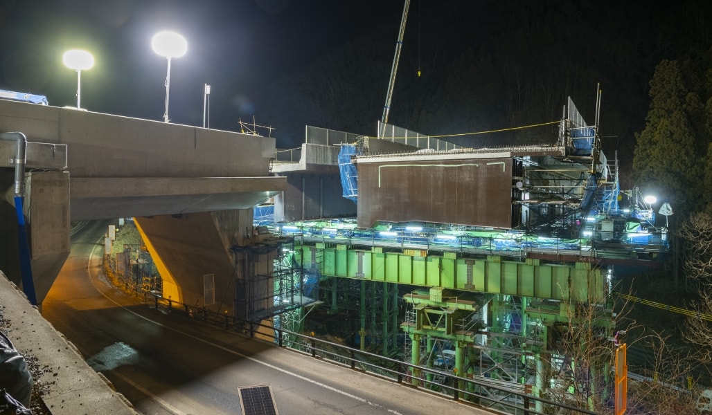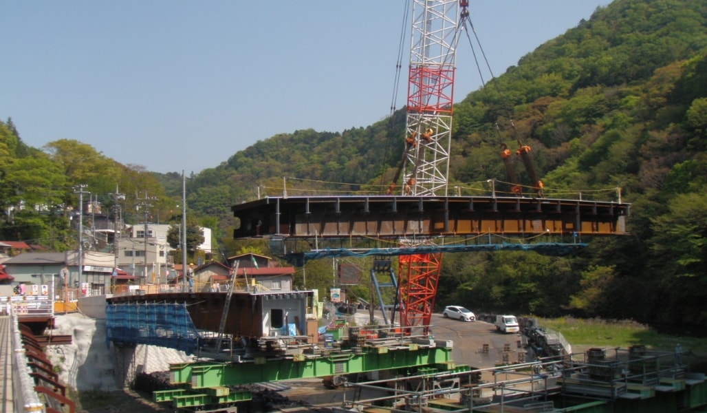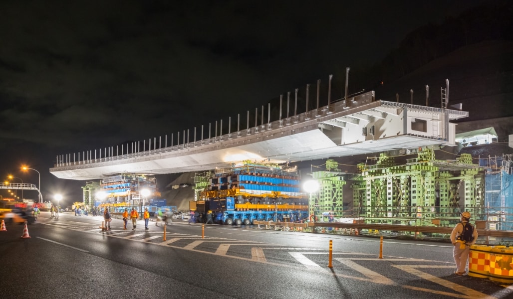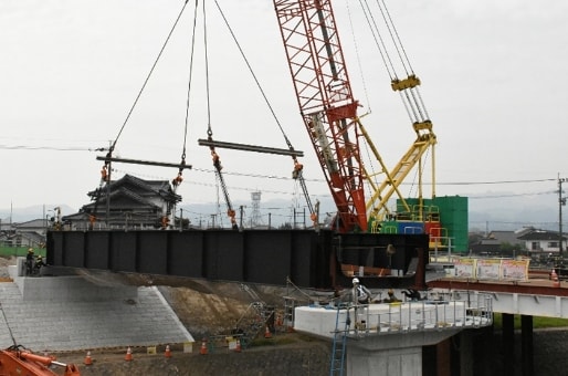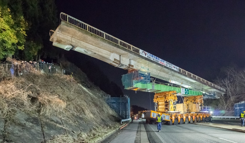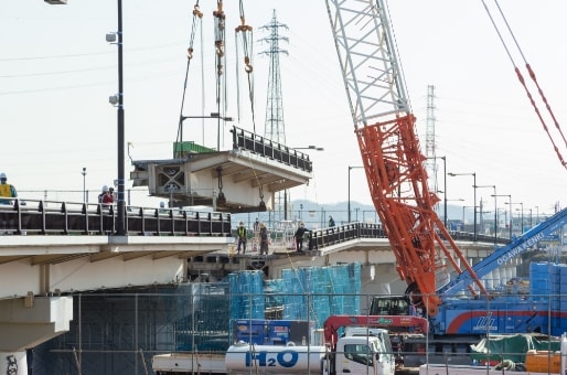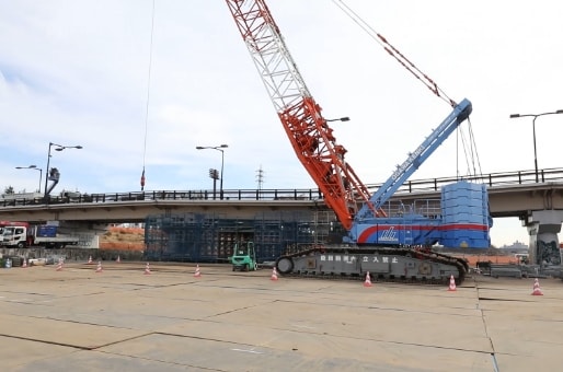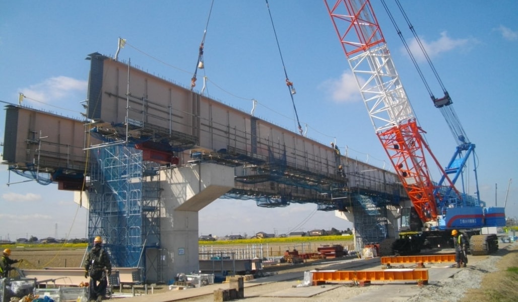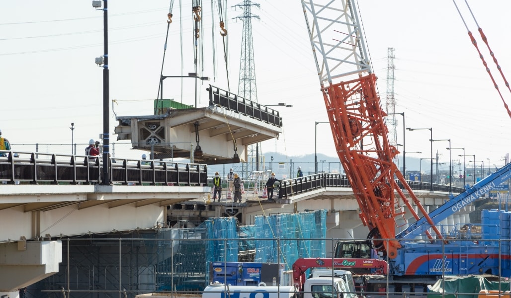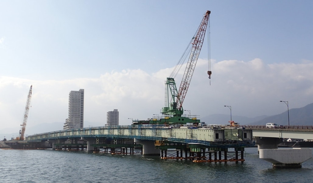 架設地点の近くに大型クレーンを組み立てるヤードが確保出来る時には、地組した大きな橋桁を大型クレーンにより一夜間で一気に架設する一括架設工法が用いられます。この工法では、架設作業に伴う通行止め等の交通影響を最小にすることが出来ます。