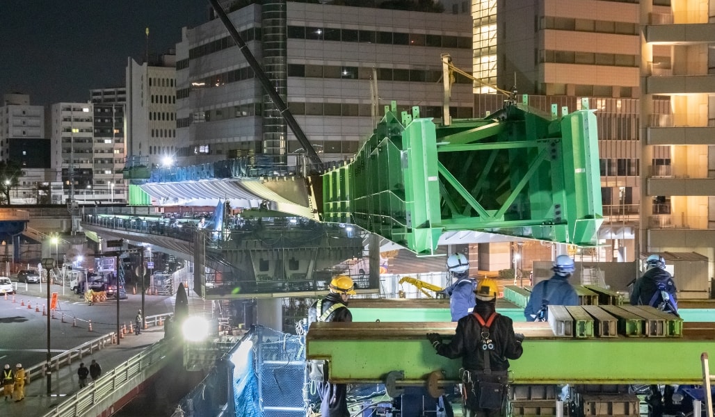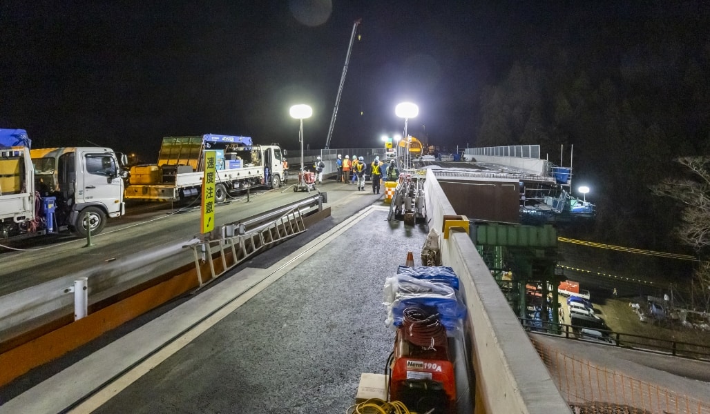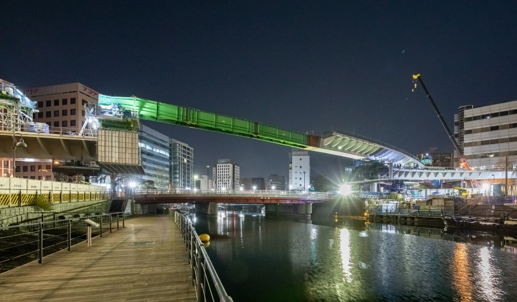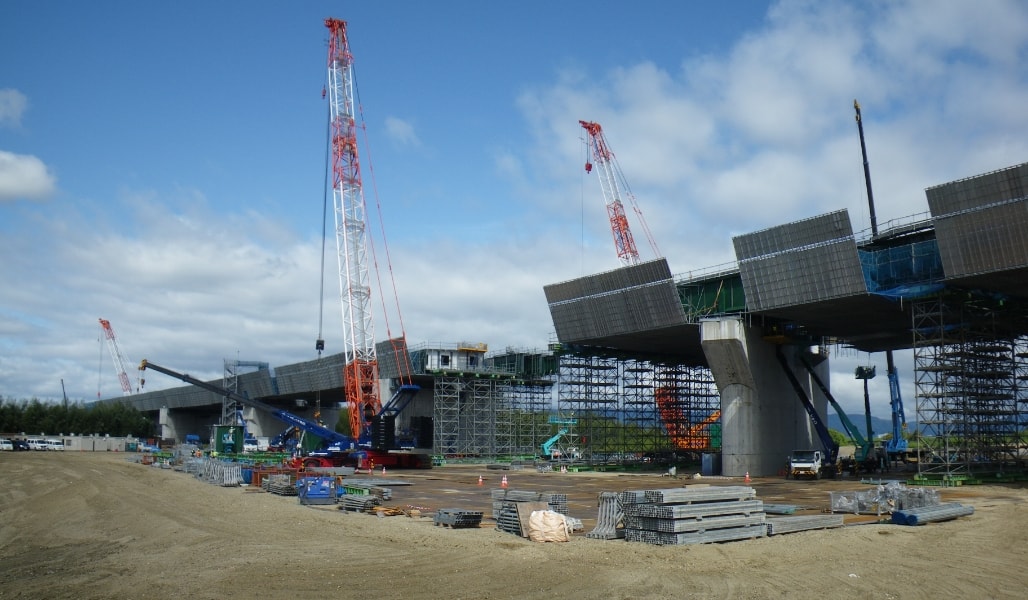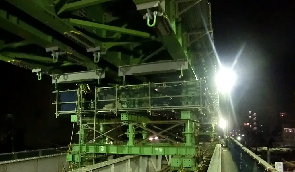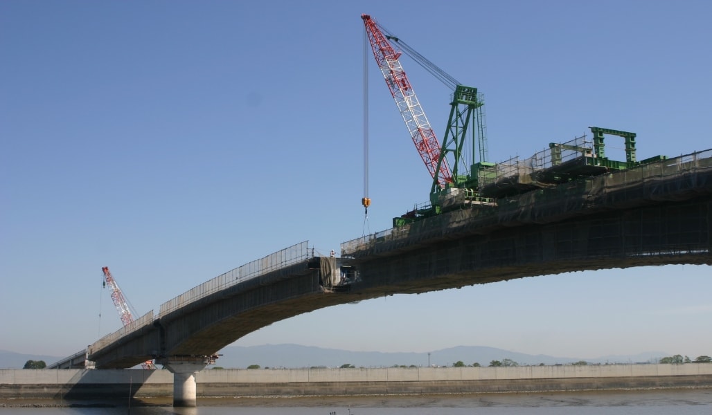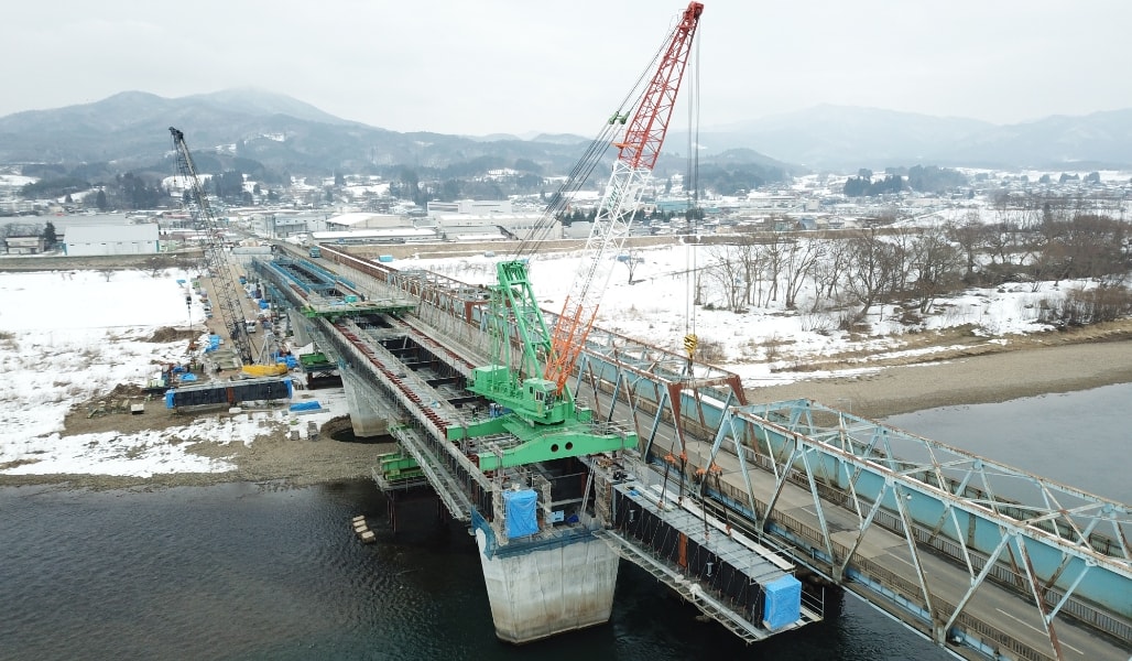 架設地点の近くに大型クレーンを組み立てるヤードが確保出来る時には、地組した大きな橋桁を大型クレーンにより一夜間で一気に架設する一括架設工法が用いられます。この工法では、架設作業に伴う通行止め等の交通影響を最小にすることが出来ます。