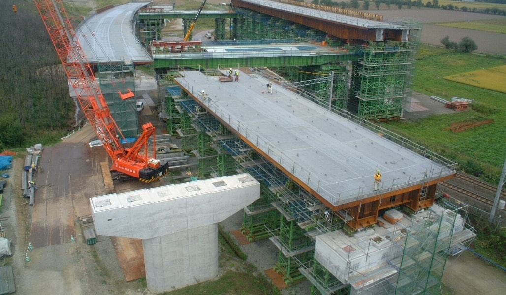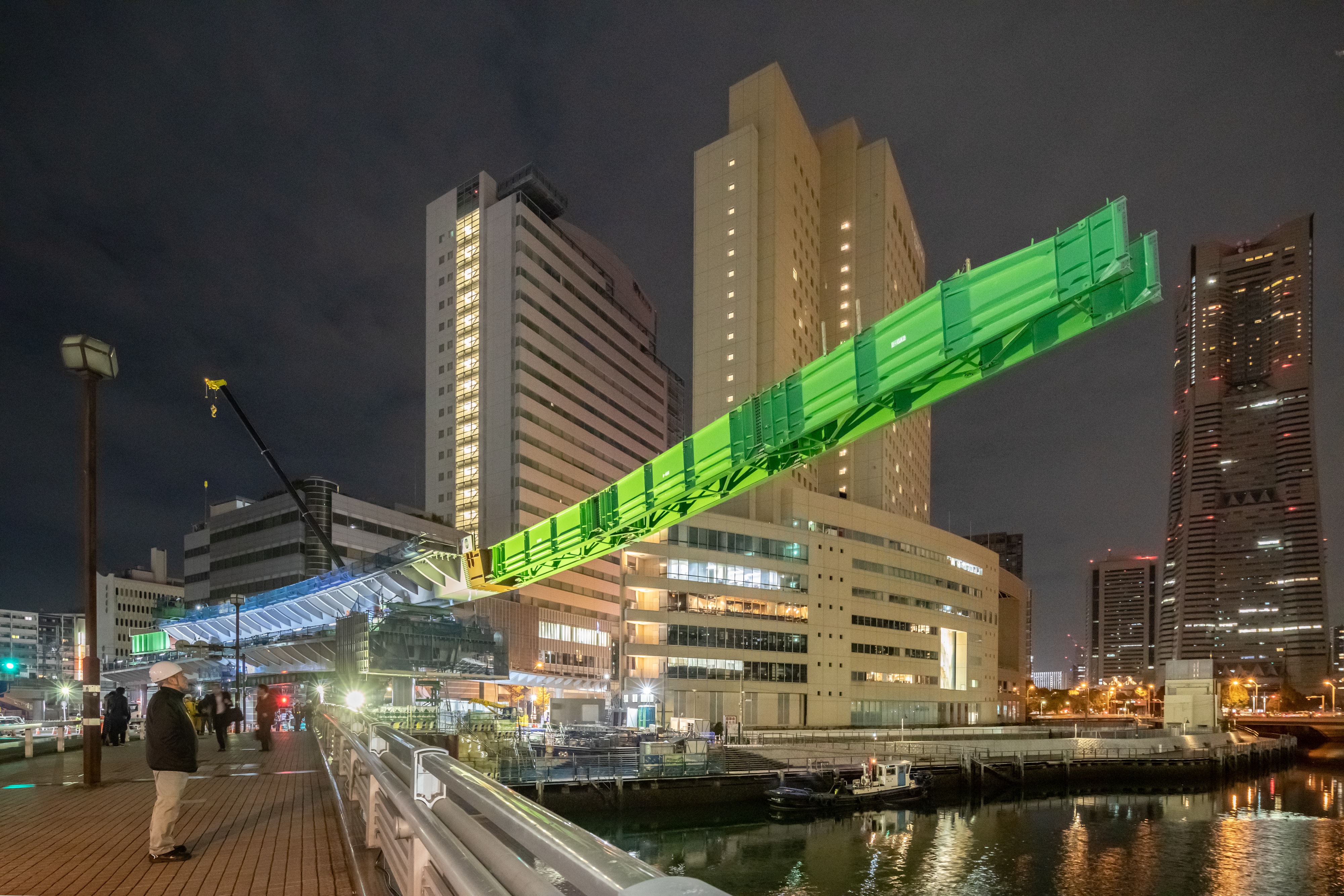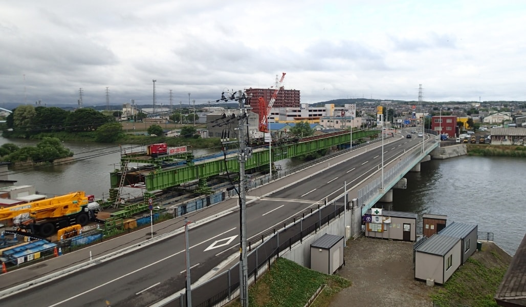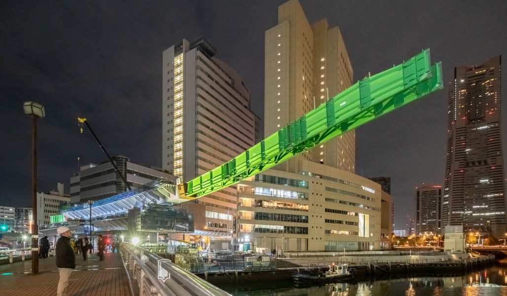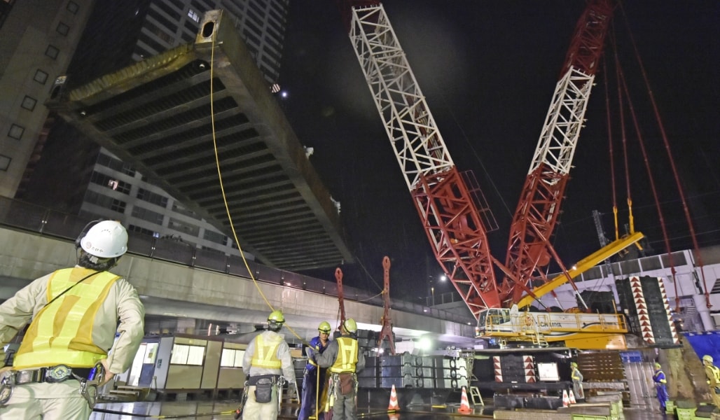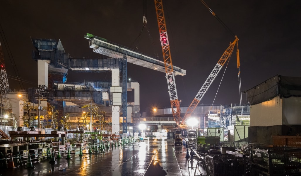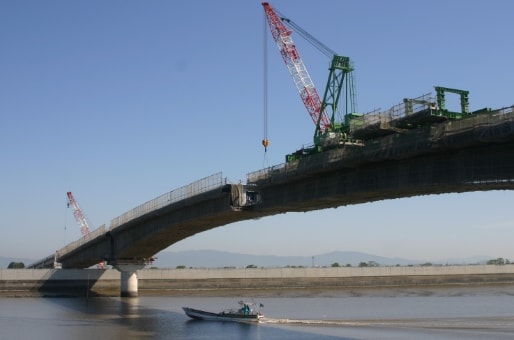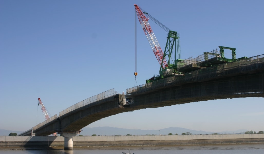 架設地点の近くに大型クレーンを組み立てるヤードが確保出来る時には、地組した大きな橋桁を大型クレーンにより一夜間で一気に架設する一括架設工法が用いられます。この工法では、架設作業に伴う通行止め等の交通影響を最小にすることが出来ます。