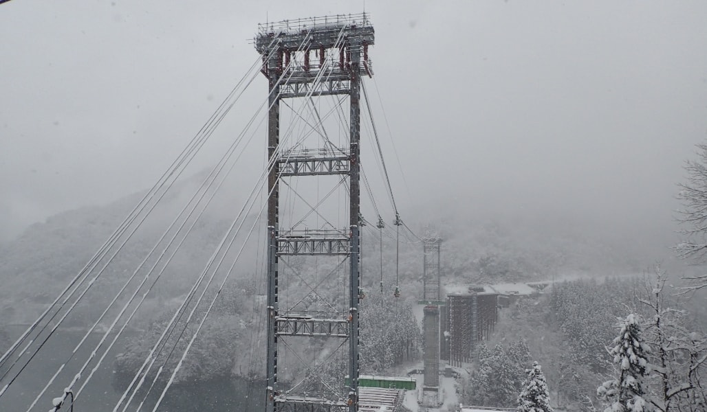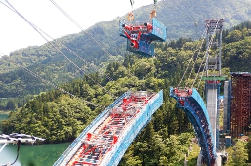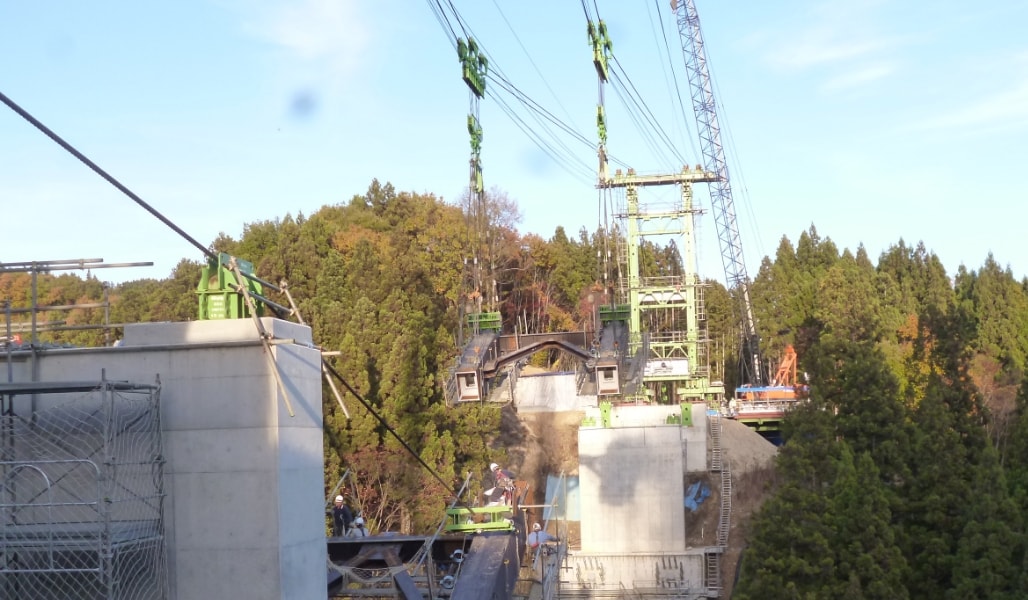 急峻な山岳地帯や、桁下が流水部で自走式クレーンの進入が困難な箇所等でよく用いられる設備です。2本の鉄塔、その間に展張した長いワイヤーロープおよびロープウェイの様に吊荷を吊り下げて移動するキャリア等で構成され、自走式クレーンでは届かない遠い位置へ橋桁を運搬して架設することが出来ます。