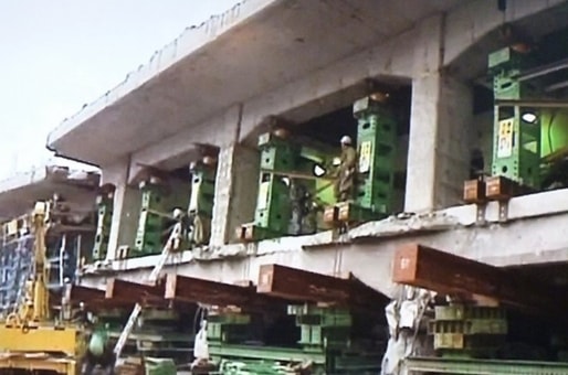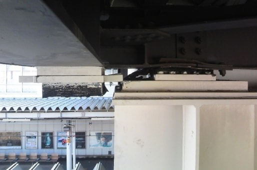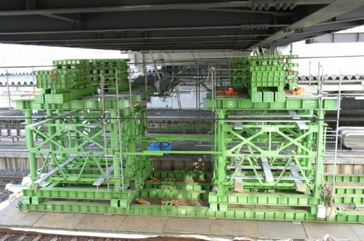 同じく地震の影響により盛岡駅付近で座屈した東北新幹線のRC高架橋支柱においても、更なる倒壊を防ぐ為の仮受架台の緊急設置を行いました。