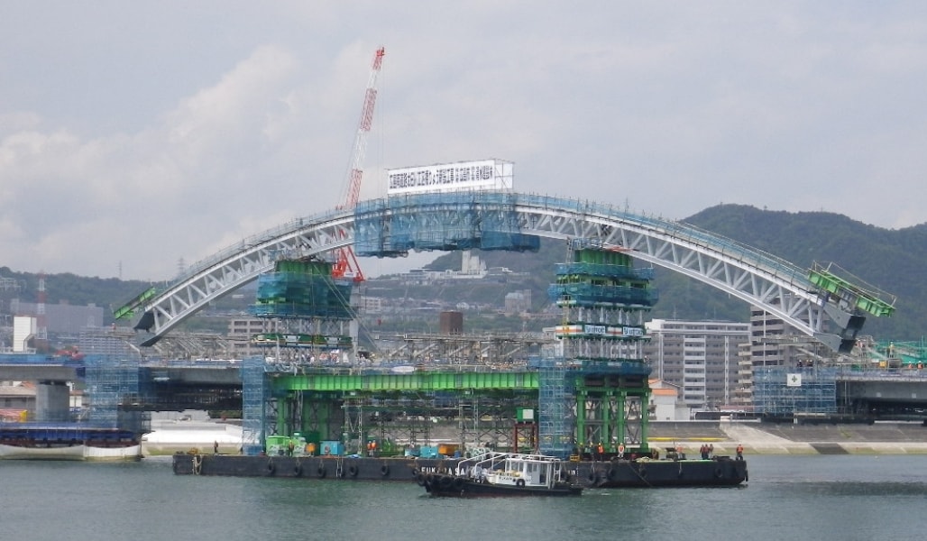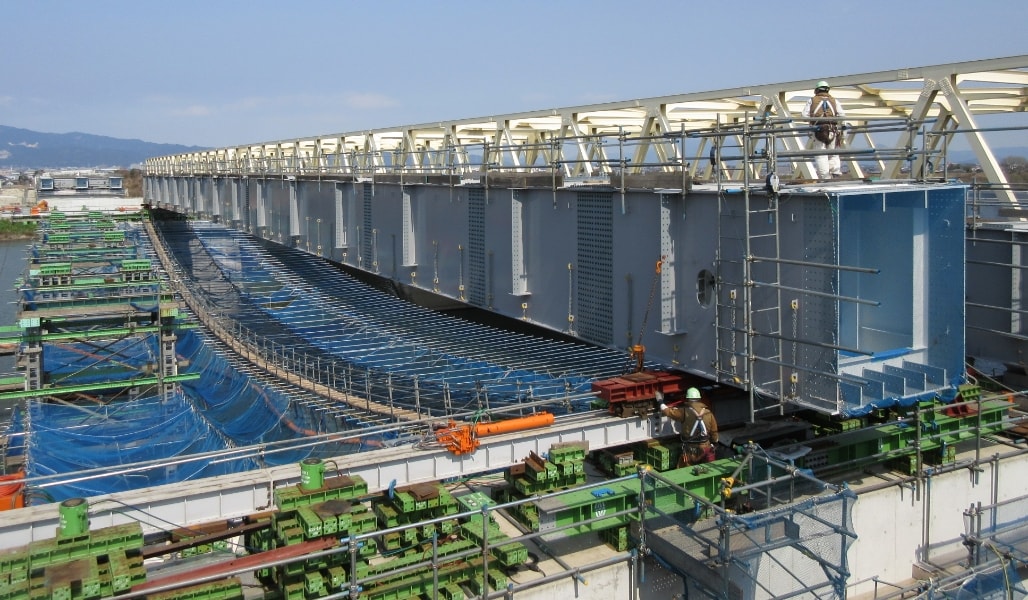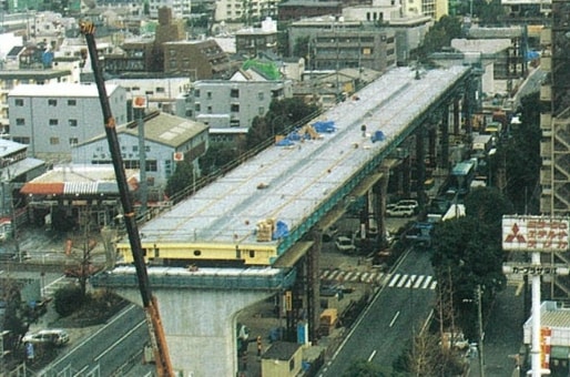 同じく地震で完全に倒壊したRC構造の高架橋を、9径間連続鋼床版箱桁橋2連(約5,400t)に架け替えた阪神高速道路3号神戸線復旧第7工区においては、持てる資本の質と量を総動員して詳細設計、製作、架設作業に取り組み、数年はかかると言われていた3号神戸線全線開通を震災からわずか1年8カ月にまで短縮させる事に大きく貢献しました。