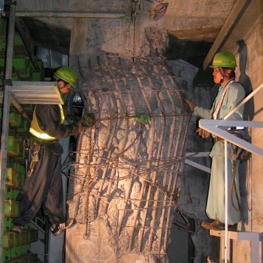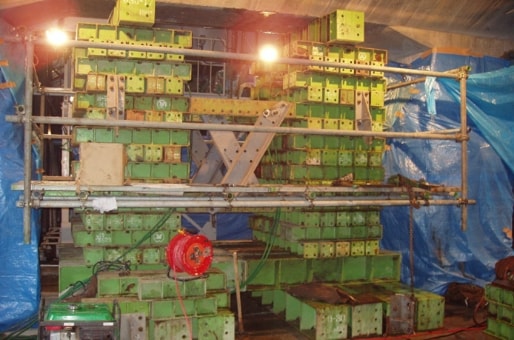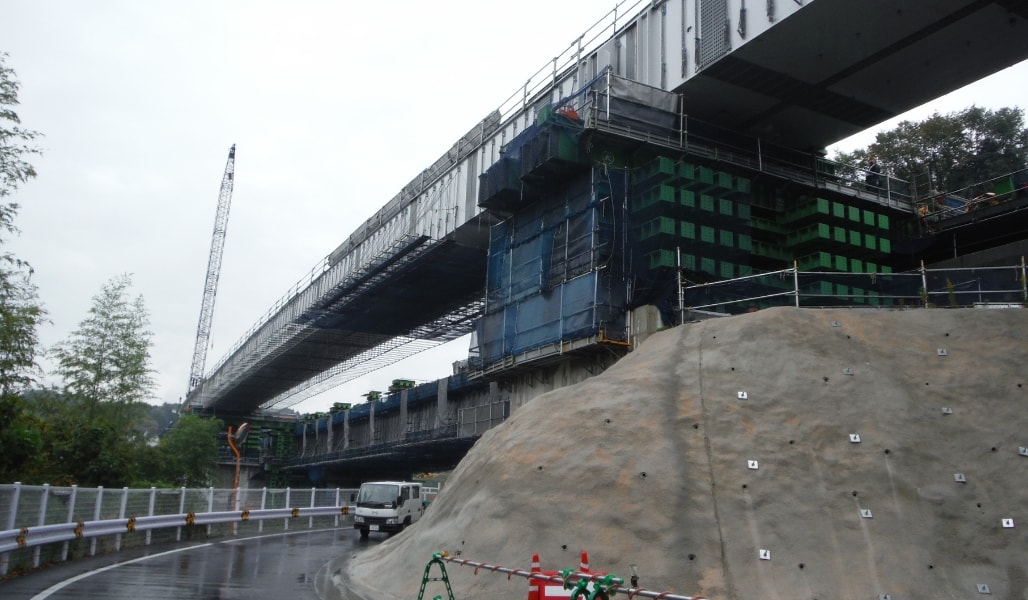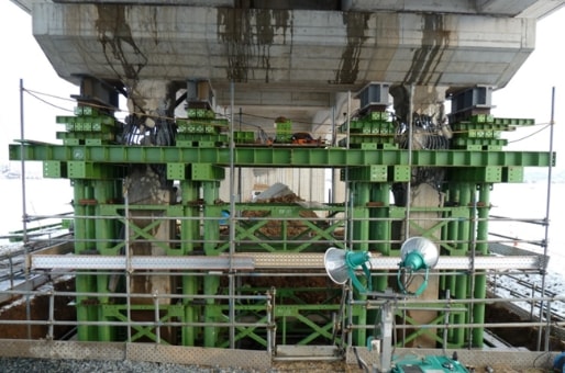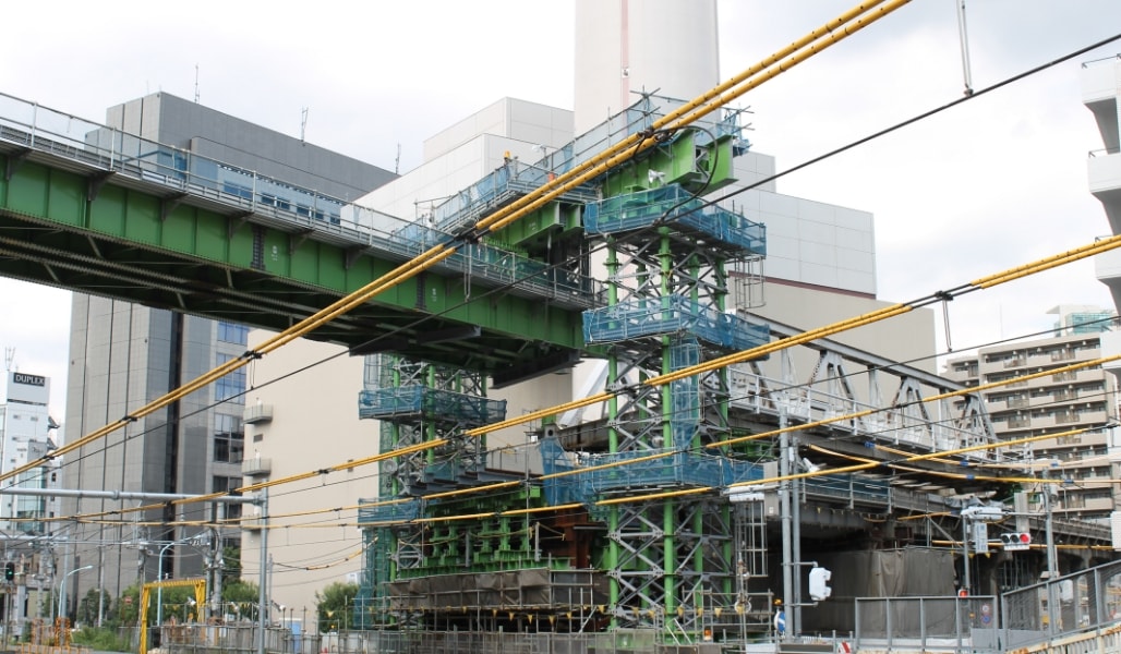 2004年10月の新潟県中越地震において座屈した上越新幹線のRC高架橋支柱において、高架橋の更なる倒壊を防ぐ為の仮受架台の緊急設置を行いました。