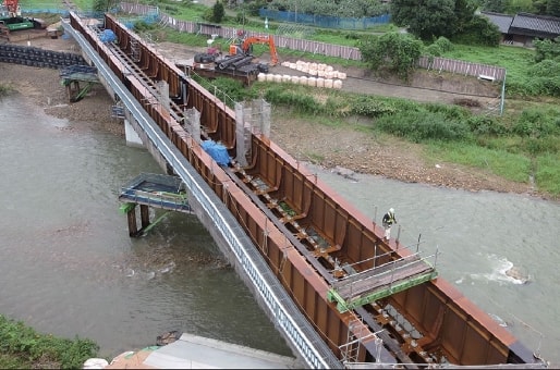 2019年10月の令和元年東日本台風(台風19号)により橋脚が沈下して通行不能となった日野橋の復旧工事において、通常であれば2年以上の工期がかかるところを、設計・製作・架け替え作業までをわずか半年で完了し、通行を再開する事が出来ました。