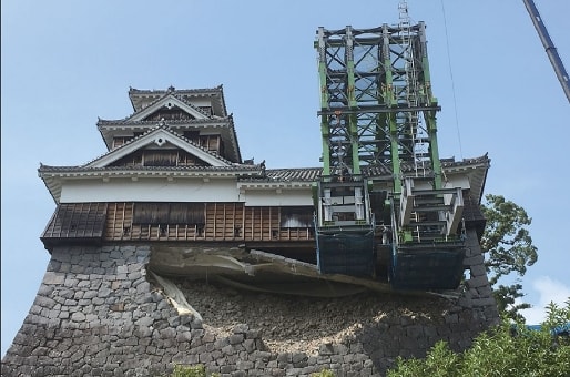 2016年4月の熊本地震により倒壊の危機に瀕していた熊本城飯田丸五階櫓の倒壊防止緊急対策工事において設置された大掛かりな設備は、MEGの所有する機材により、これ以上倒壊させない為に細心の注意を払って計画・施工したものです。他にも、地震により大きな被害を受けた俵山大橋(県道熊本高森線)および第一白川橋りょう(南阿蘇鉄道)の架け替え工事の施工等も行いました。