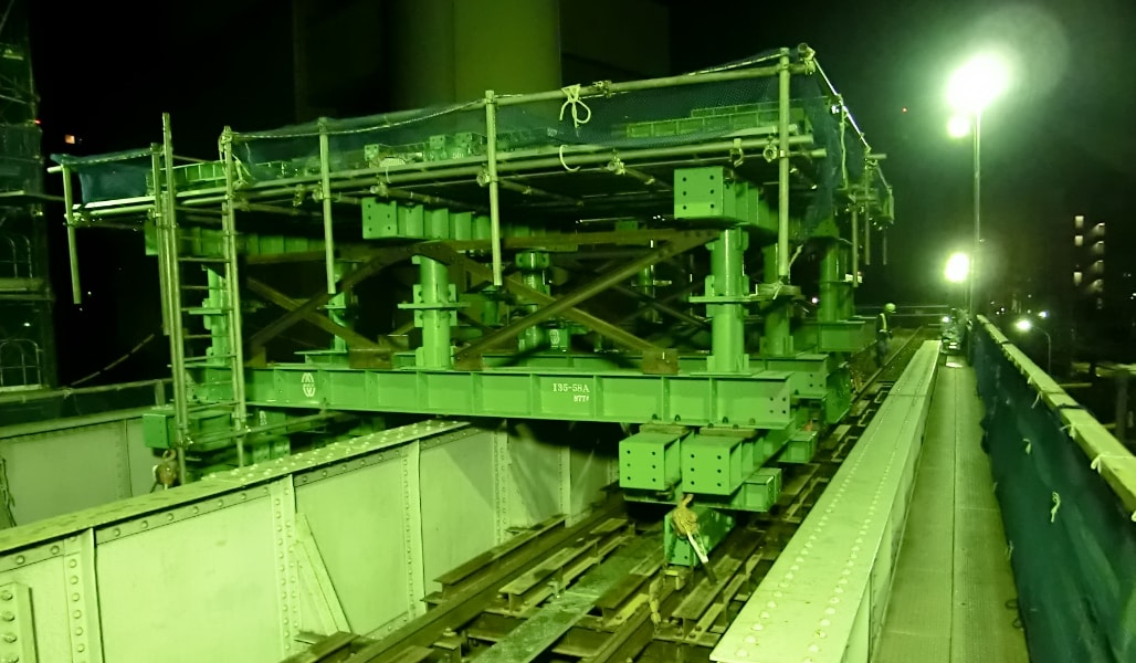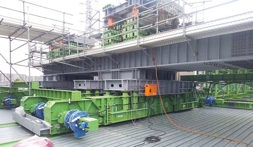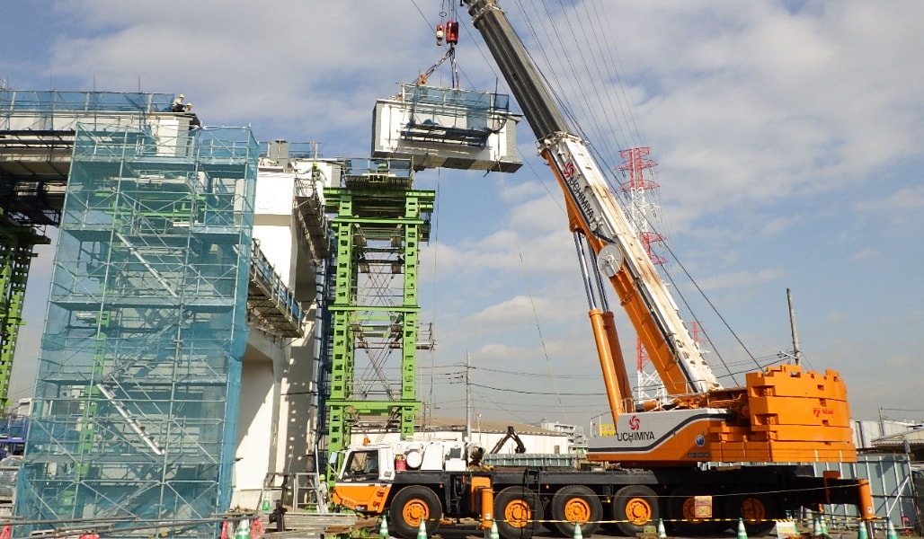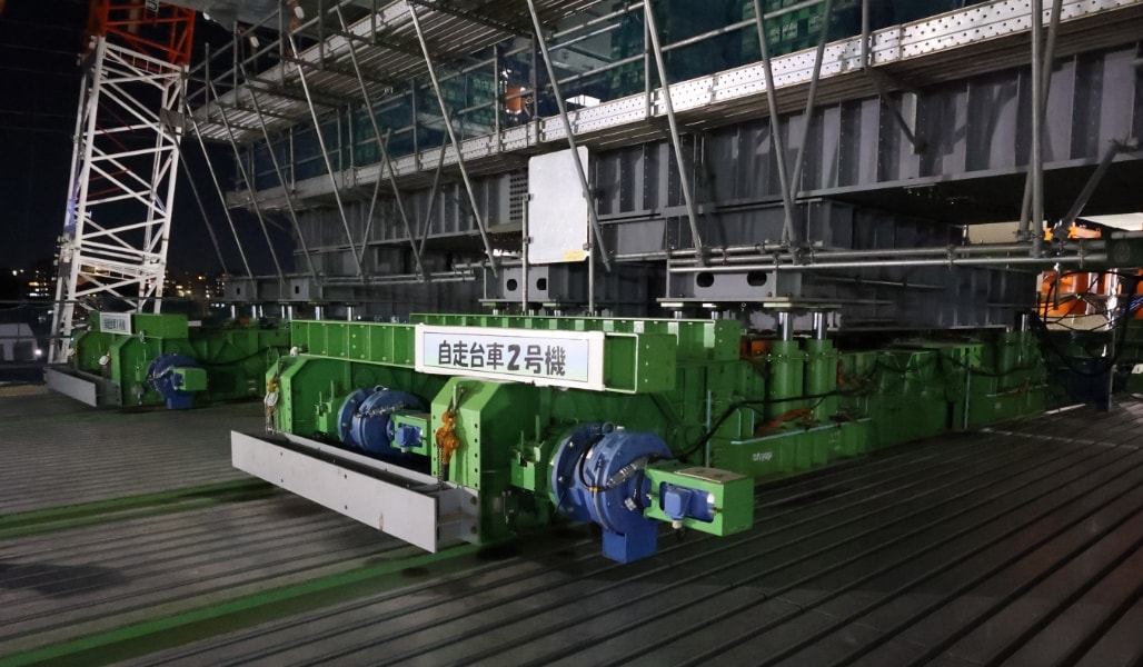 そのような大重量物を運搬して組み立て、仮支持あるいは移動させるためには、市中の汎用リース品では対応できず、大重量物に対応可能な専用の機材を用いることが必要不可欠となります。