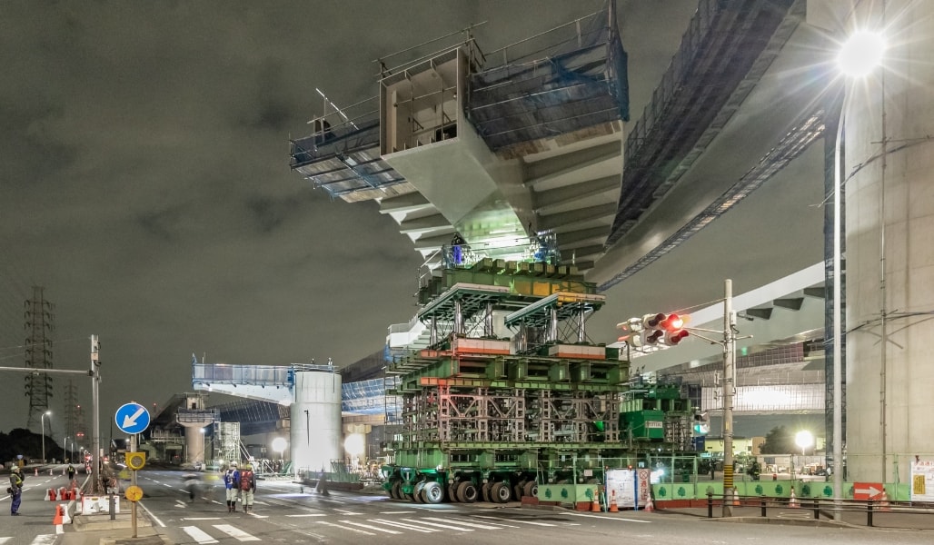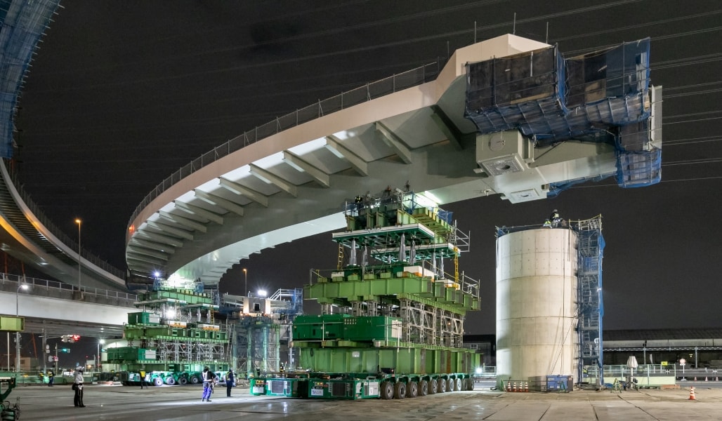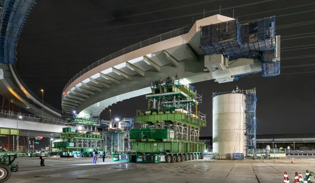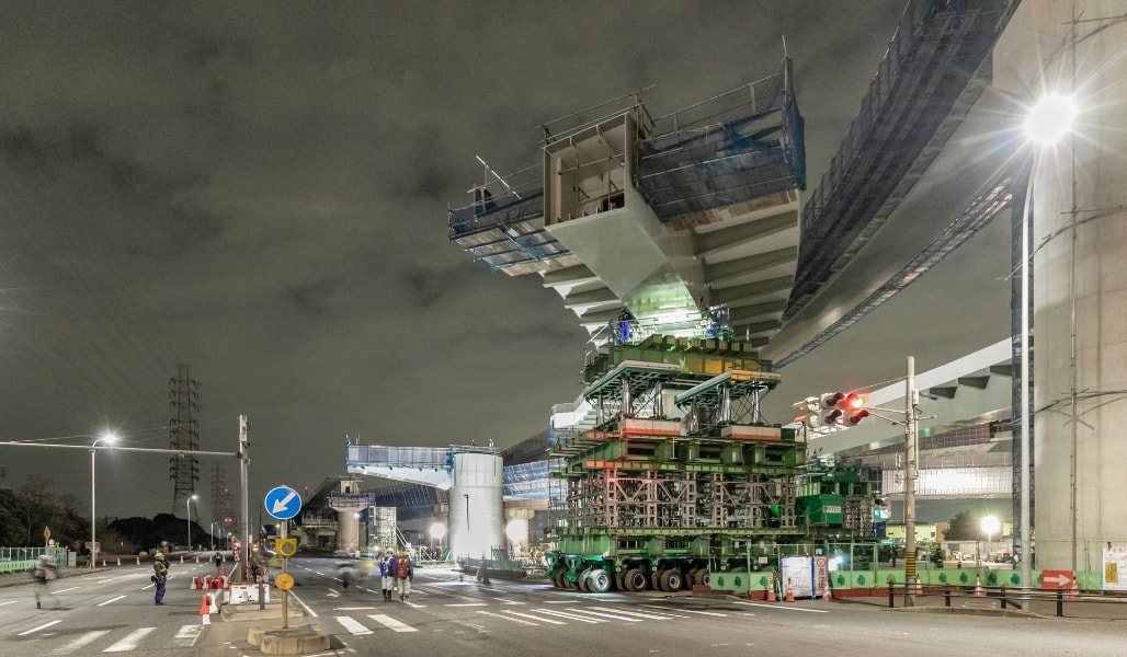 架設地点とは別の地組ヤードにて組み立てた橋桁を、通常の道路も走行することが可能な自走多軸台車の上に搭載して運搬し、架設する工法です。自走多軸台車は360度方向変換出来る上に、ある程度の段差や勾配にも対応することが出来ます。