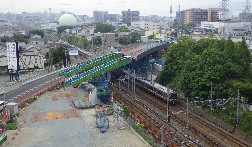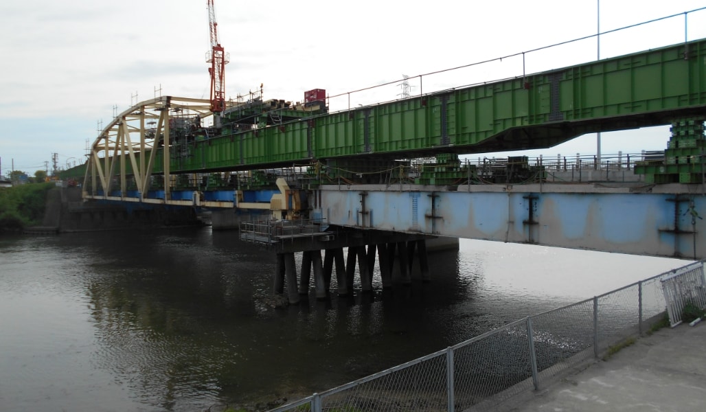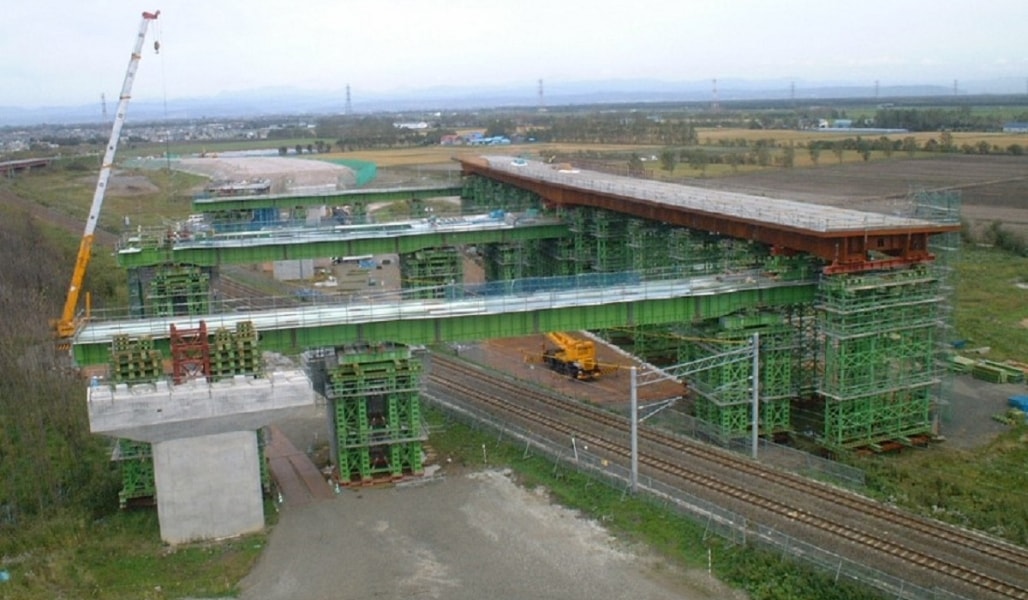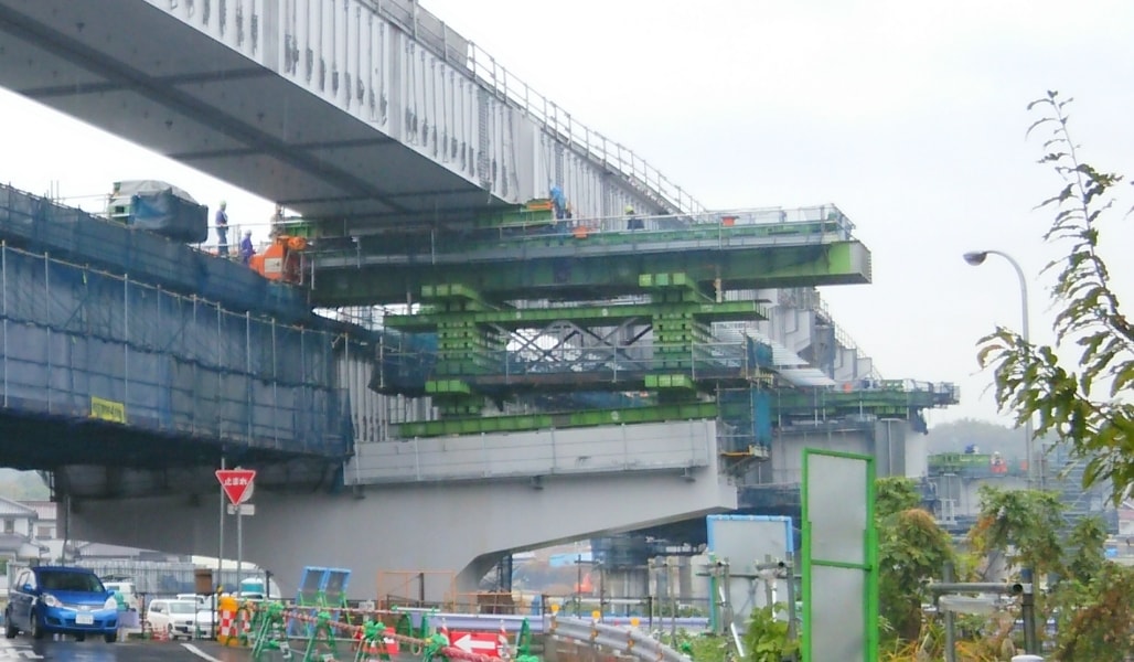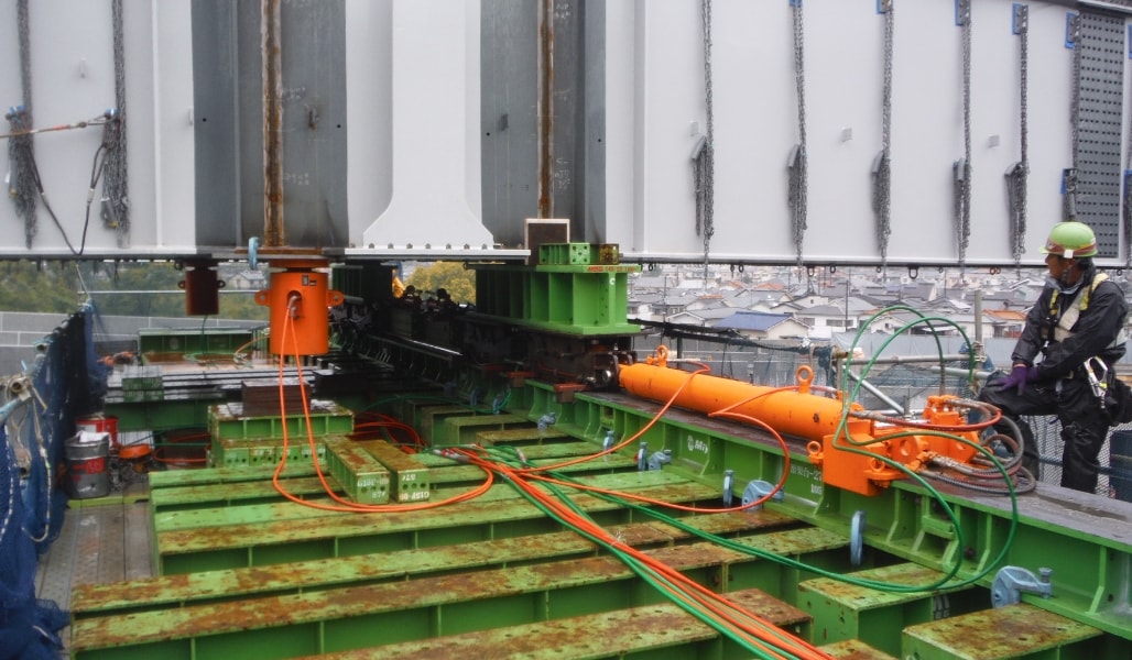橋脚上に配置したスライドジャッキ等の仮設備により、正規の位置とは横にずれた場所で地組した桁を横スライドして、正規の位置に据え付ける工法です。クレーン架設時の俯角による交通影響縮減や、道路や線路上での作業時間を短縮できる効果等があります。
