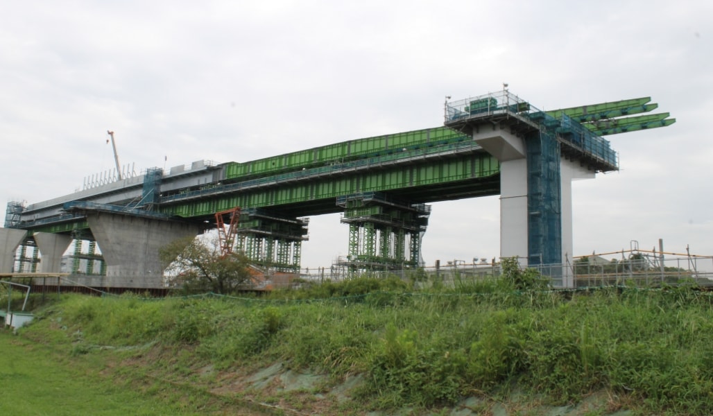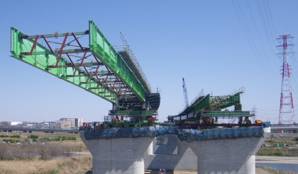 架設する橋の上に設置して橋桁の架設を行う為に開発された、トラベラークレーンを用いて架設を行う工法です。橋桁の上に設置するには重量を軽くする必要があるため、トラベラークレーンには通常のクレーンで吊り荷とバランスをとるために設置されているカウンターウェイトの代わりに、橋桁から直接反力をとるための特殊な設備が設置されております。