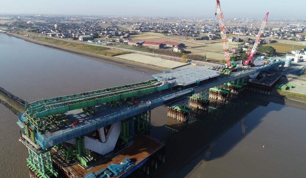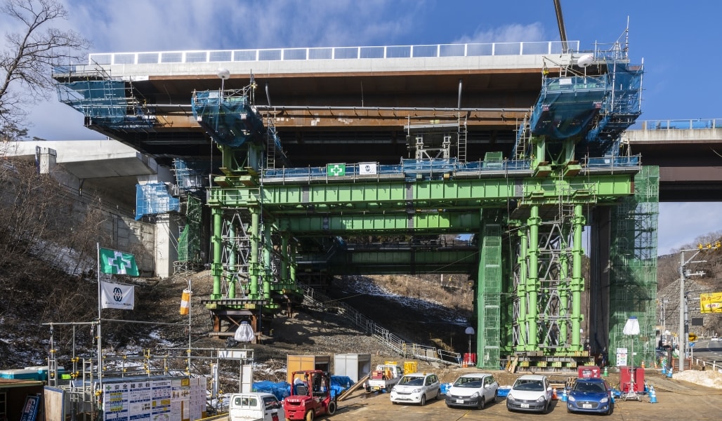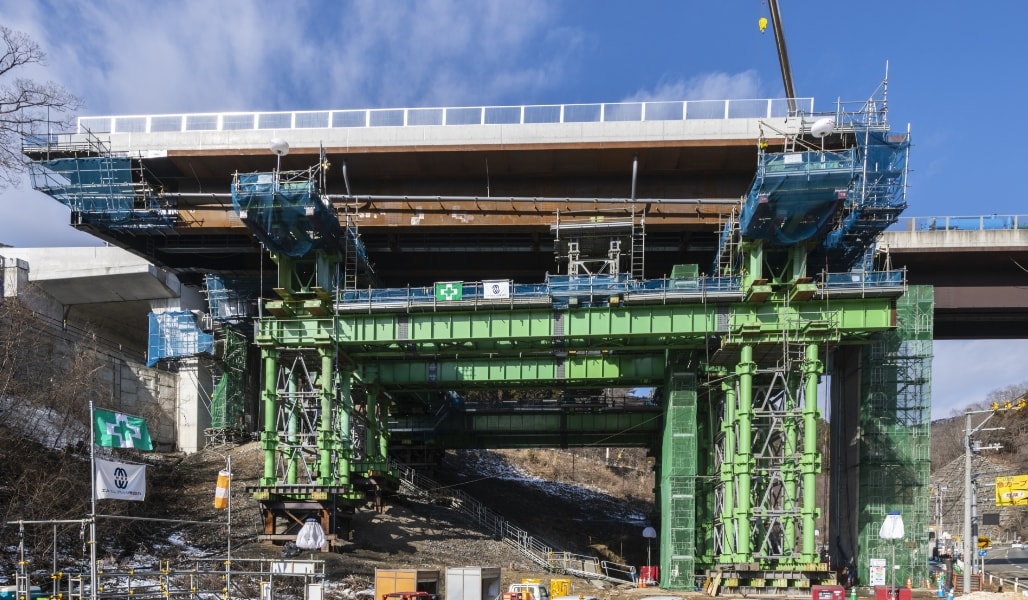 橋梁の架設工事では、小割して製作されたブロックをベント(=仮受け台)で受けながら順次架設するクレーンベント架設工法が主流ですが、道路や鉄道の上を跨ぐ等、長期にわたる通行止めが難しい箇所においては、送り出し等の特殊架設工法により施工を行う必要があります。そして、それを実現するためには数多くの特殊架設機材と、それらを用いた架設計画力と現場管理能力が必要不可欠となります。高難度な特殊架設工事を数多く手掛けてきたMEGは、短時間で鉄道上等を架設するための高速送り出し機材や、大ブロックを一括架設するための大型ユニットジャッキ等を開発した実績も多数保有しており、特殊架設に関する業界屈伸の技術力を保有しております。また、技術的難易度の高い大規模更新工事や大型工事への取り組みを拡大するためには、常に多くの特殊機材を備えておく必要があることから、MEGは全国4か所に機材センターを置き豊富な戦略・特殊機材の維持・更新を行っております。さらに、MEGは災害発生時に損傷した社会的インフラの緊急復旧工事においても、それらの豊富な戦略機材を駆使することにより、早期復旧に数多くの貢献をしてまいりました。