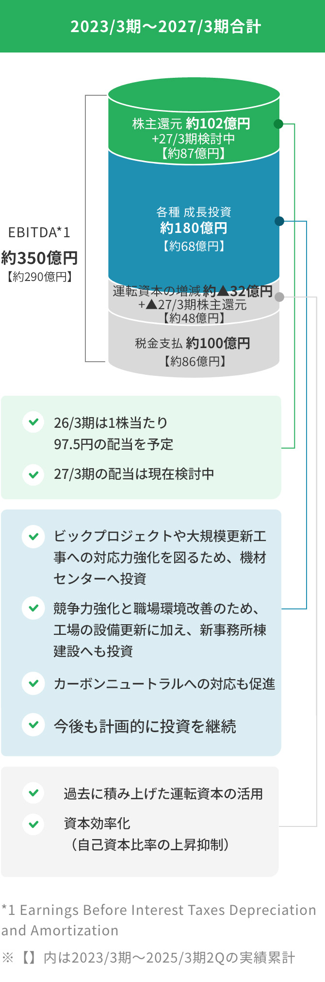 一定の資本拡充および成長投資も確保の上で、株主還元の維持・拡大を図ります。具体的には、中期経営計画の期間内に稼ぎ出すEBITDAについて約400億円を見込んでおり、成長投資に約180~200億円を投じる予定です。また、株主還元として総還元性向60%を目安に還元を維持・拡大していく予定です。